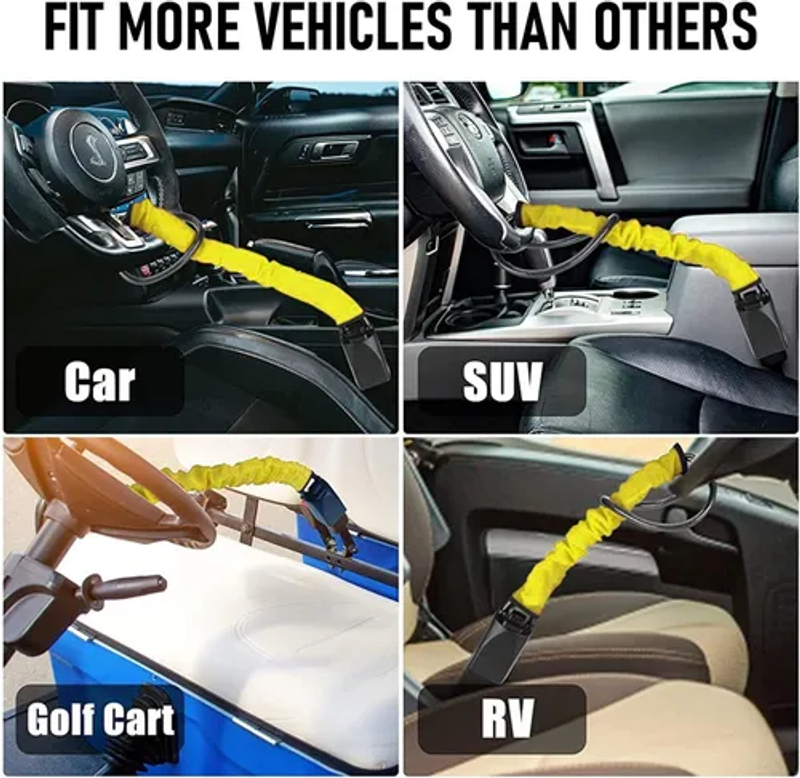 This ultra-tough steering wheel lock features military-grade steel and an anti-pry mechanism that defeats even bolt cutters. Visible deterrence meets brute strength—giving thieves zero chance!
