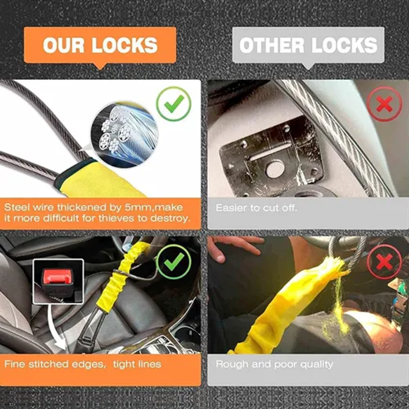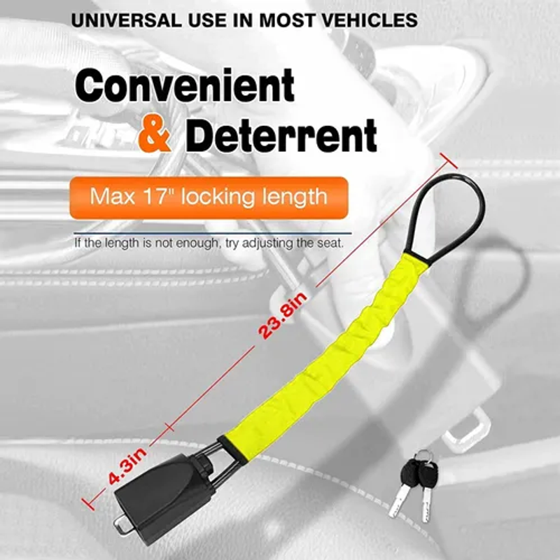 This steering wheel lock doesn't just protect your car; it also gives you a sense of security! Its high-strength construction creates an unbreakable barrier that simultaneously locks your steering wheel and seatbelt buckle. When thieves spot this eye-catching guardian, they'll think twice—it not only provides the ultimate visual deterrent but also fortress-like protection.
