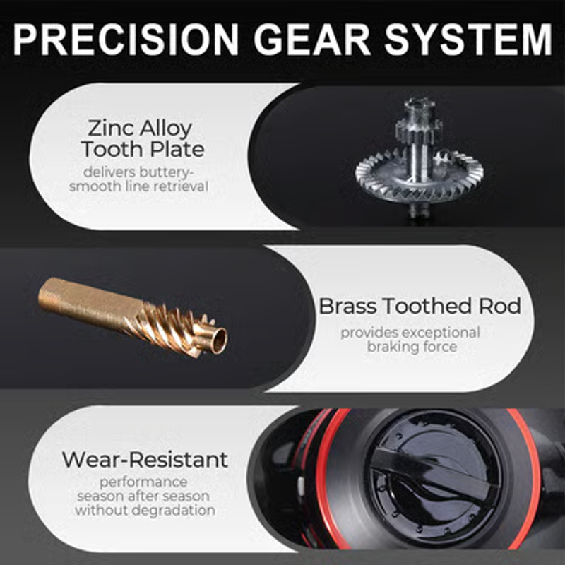 PRECISION GEAR SYSTEM – The zinc alloy tooth plate delivers buttery-smooth line retrieval, while the brass toothed rod provides exceptional braking force. The wear-resistant construction maintains performance season after season without degradation.
