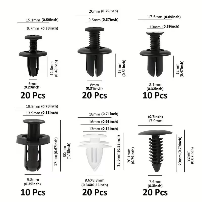 Features: These clips fasteners are made of nylon material, suitable for car use. Cars good accessory, commonly used for fitting side skirts, bumpers and other trim. Need not worry about lost or damaged body fasteners.All the necessary retainers for exact replacement of old and broken retainers. Specifications: Material: Nylon Size: As shown Packing: OPP Bag Package included: 20 x C05 Rivet Fasteners 20 x C20 Rivet Fasteners 10 x C32 Rivet Fasteners 10 x B01 Rivet Fasteners